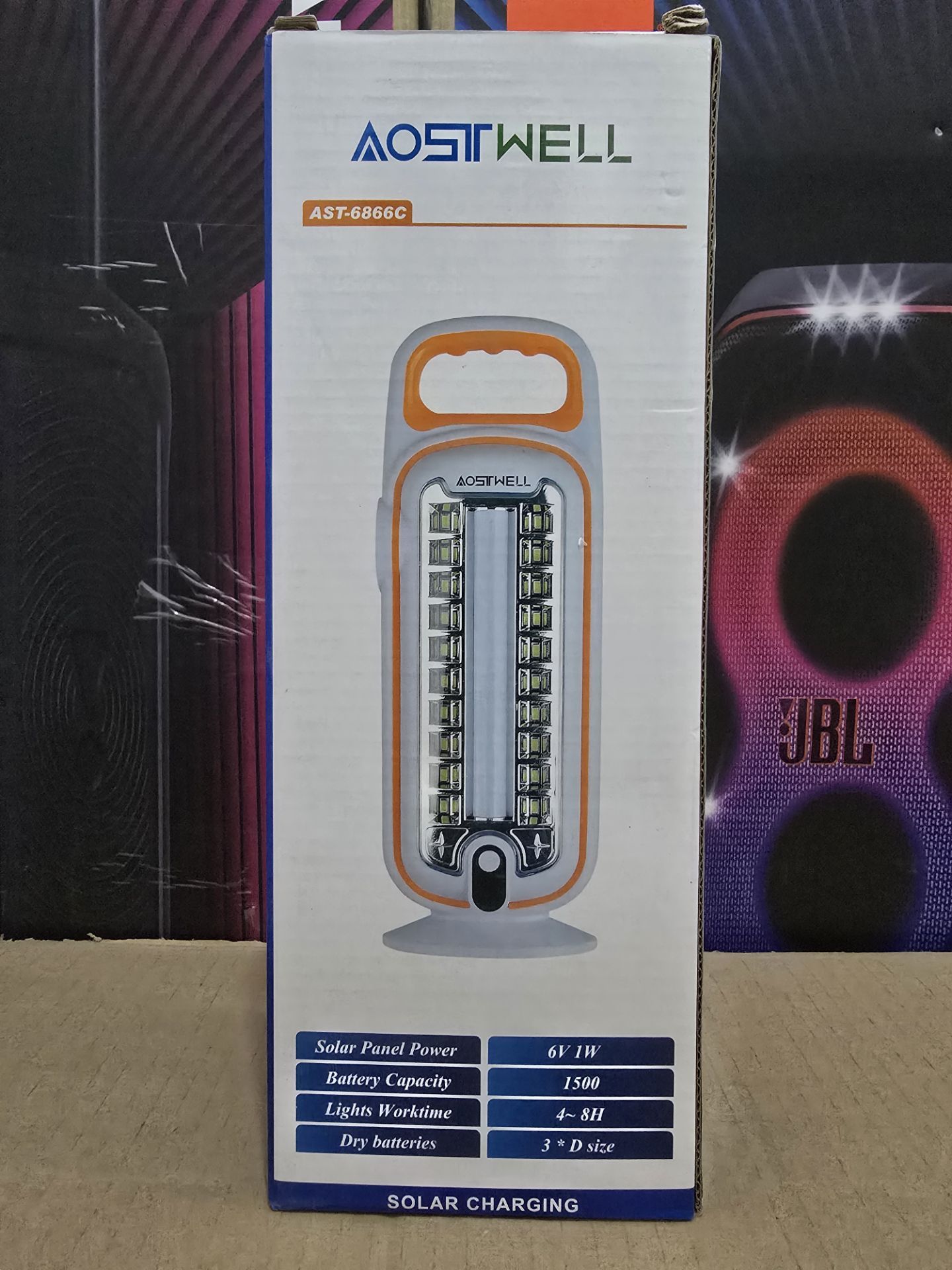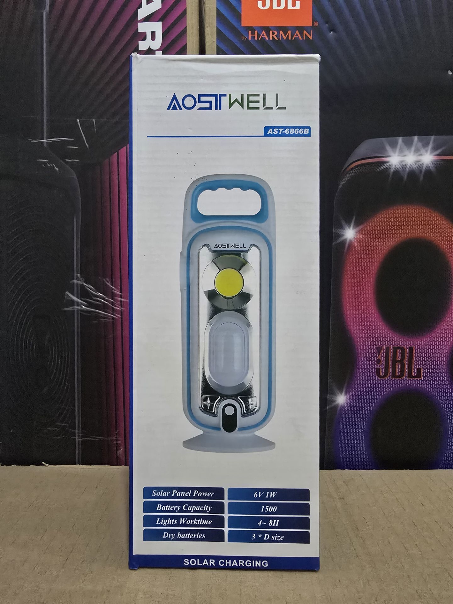 چراغ اضطراری شارژی آستول (AOSTWELL) مدل AST-6866B - مجهز به پنل خورشیدی برای شارژ، باتری داخلی ۱۵۰۰ میلیآمپر و قابلیت کار با ۳ عدد باتری سایز D (مناسب برای کمپینگ و زمان قطعی برق)
