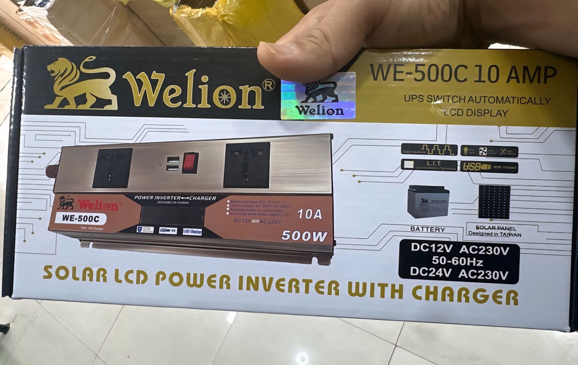 اینورتر و شارژر هوشمند ولیون (Welion) مدل WE-500C توان ۵۰۰ وات - مجهز به نمایشگر LCD، خروجی USB و قابلیت سوییچ خودکار UPS (تبدیل ۱۲ به ۲۲۰ ولت با شارژر ۱۰ آمپر و ورودی پنل خورشیدی)