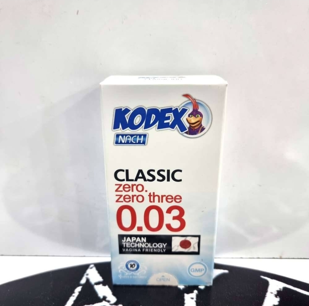 کاندوم کلاسیک کدکس (KODEX) مدل 0.03 فوق نازک؛ بسته ۱۰ عددی، ساخته شده با تکنولوژی ژاپن از لاتکس ۱۰۰ درصد طبیعی؛ با ضخامت بسیار کم جهت انتقال حداکثر احساس، مقاوم و ایمن، دارای لوبریکانت ماندگار برای لذت بیشتر و رایحه مطبوع.
