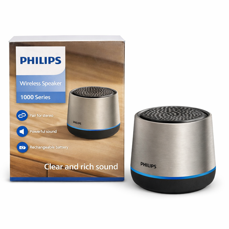 Philips Wireless Speaker 1000 Series یک اسپیکر بیسیم از برند فیلیپس است که روی بستهبندی آن به Clear and rich sound (صدای شفاف و غنی) اشاره شده. اگر دنبال یک اسپیکر جمعوجور برای استفاده روزمره هستی که صدا تمیز و واضح بده، این مدل دقیقا با همین هدف معرفی شده.